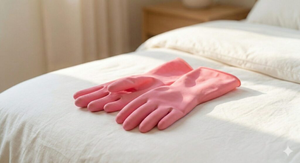 ゴム手袋をはめた手で布団の表面を円を描くようにこすると、摩擦と静電気で繊維の奥の毛が引き出されます。コロコロで取れなかった深い部分の毛に特に効果的です。