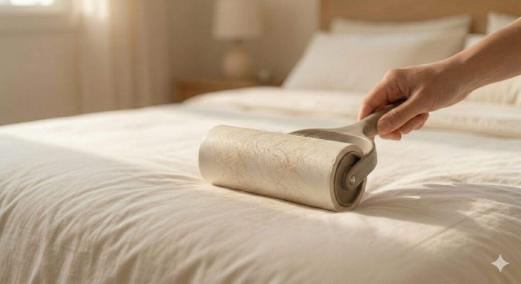粘着式クリーナーを使い、縦・横・斜めの3方向から丁寧に転がします。一方向だけでは取り切れない毛も、向きを変えることで効果が高まります。シートはこまめに取り替えるのがポイントです。