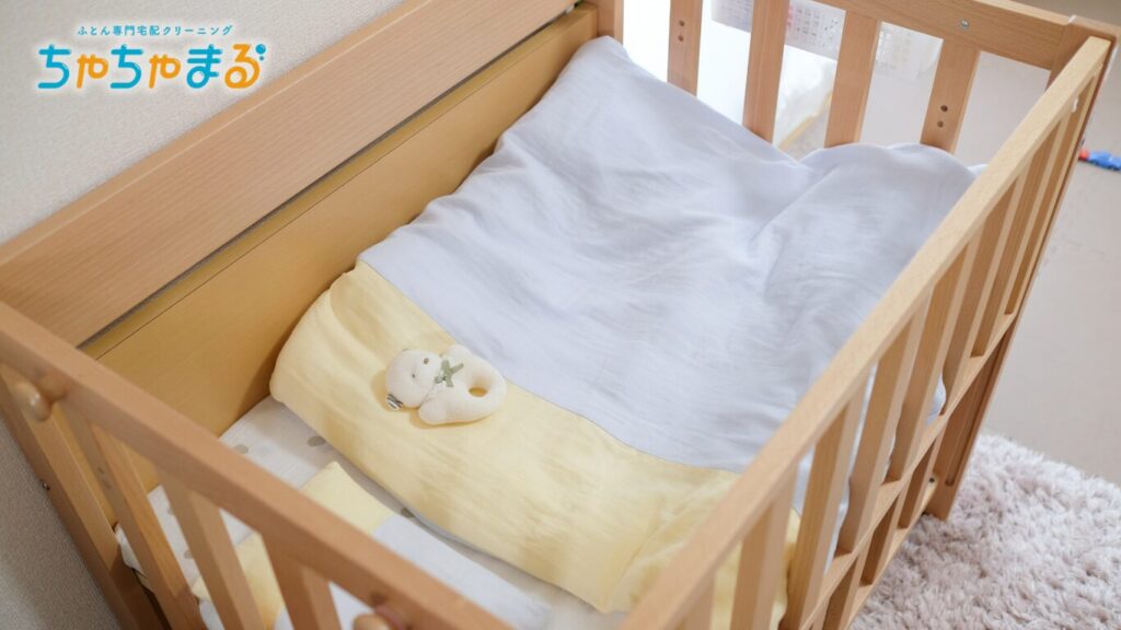 赤ちゃん用の掛け布団は、洗濯機で丸洗いできる素材(ポリエステル・綿など)のものが多く、自宅でのケアがしやすいのが特徴です。日常的なケアとして、晴れた日に風通しの良い場所で陰干しすることで、湿気を飛ばしてダニの繁殖を抑えることができます。洗濯は月に1〜2回を目安に、洗濯ネットに入れて毛布・布団コースまたは手洗いコースで優しく洗いましょう。脱水は短時間に設定し、洗濯後は十分に乾燥させることが重要です。羽毛素材の掛け布団は洗濯表示をよく確認し、洗濯不可の場合は無理に自宅で洗わずにクリーニングへ出しましょう。