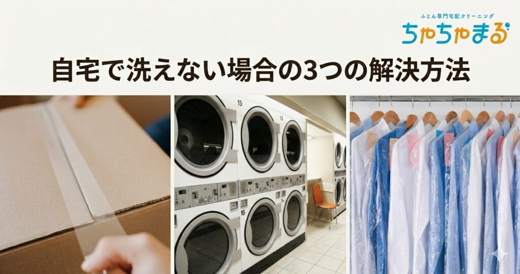 自宅で布団を洗えない場合でも、宅配クリーニング・コインランドリー・店舗持ち込みという3つの選択肢があります。素材が繊細でプロの技術が必要な場合や手間をかけたくない場合は宅配クリーニング、費用を抑えて当日中に仕上げたい場合はコインランドリー、というように素材・予算・時間に合わせて使い分けることがポイントです。