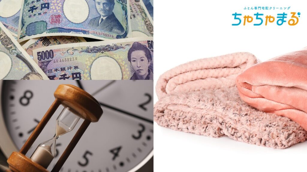 コインランドリーは洗濯・乾燥あわせて1〜2時間程度で完了し、当日中に布団が戻ってきます。急いで洗いたいときや、代わりの布団が用意できない場合には大きなメリットです。宅配クリーニングは集荷から返送まで通常1〜2週間かかります。その間は代わりの寝具が必要になるため、余裕を持ったスケジュールで依頼することが必要です。急ぎの場合はコインランドリー、品質重視・素材への安全性を優先するなら宅配クリーニング、というシンプルな判断基準が使いやすいでしょう。